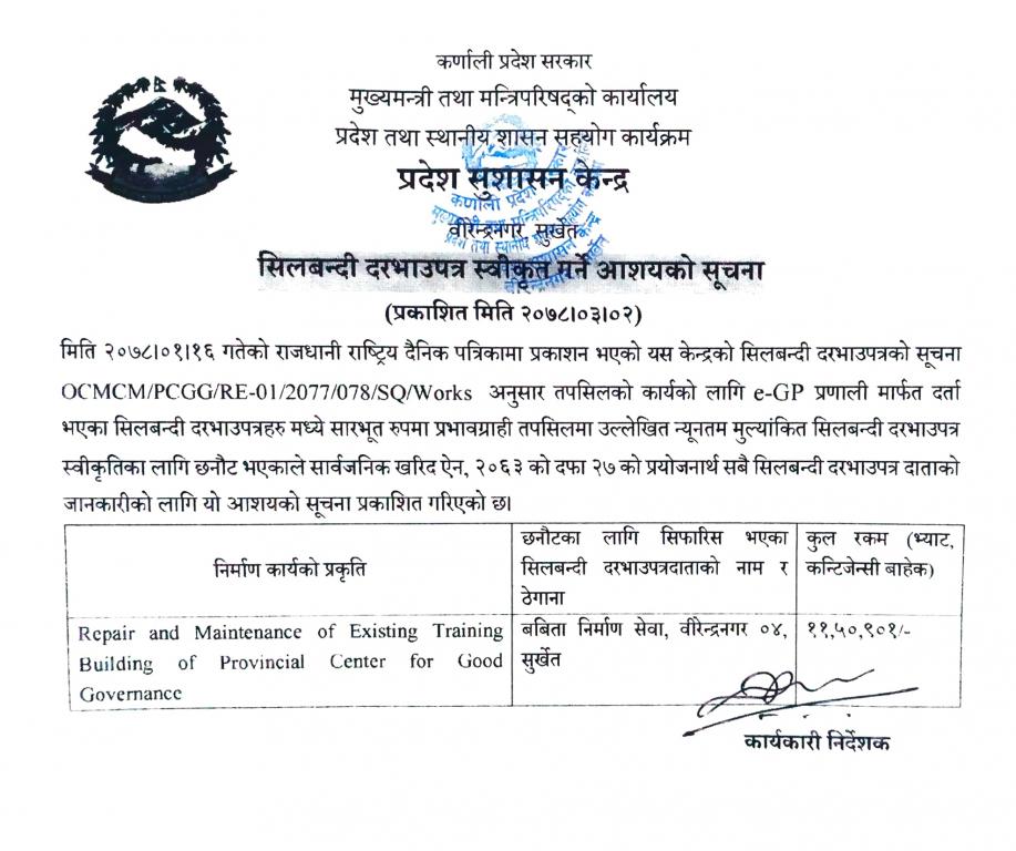 प्रदेश सुशासन केन्द्रको शिलबन्दी दरभाउपत्र स्वीकृत गर्ने आशयपत्र सम्बन्धमा। |