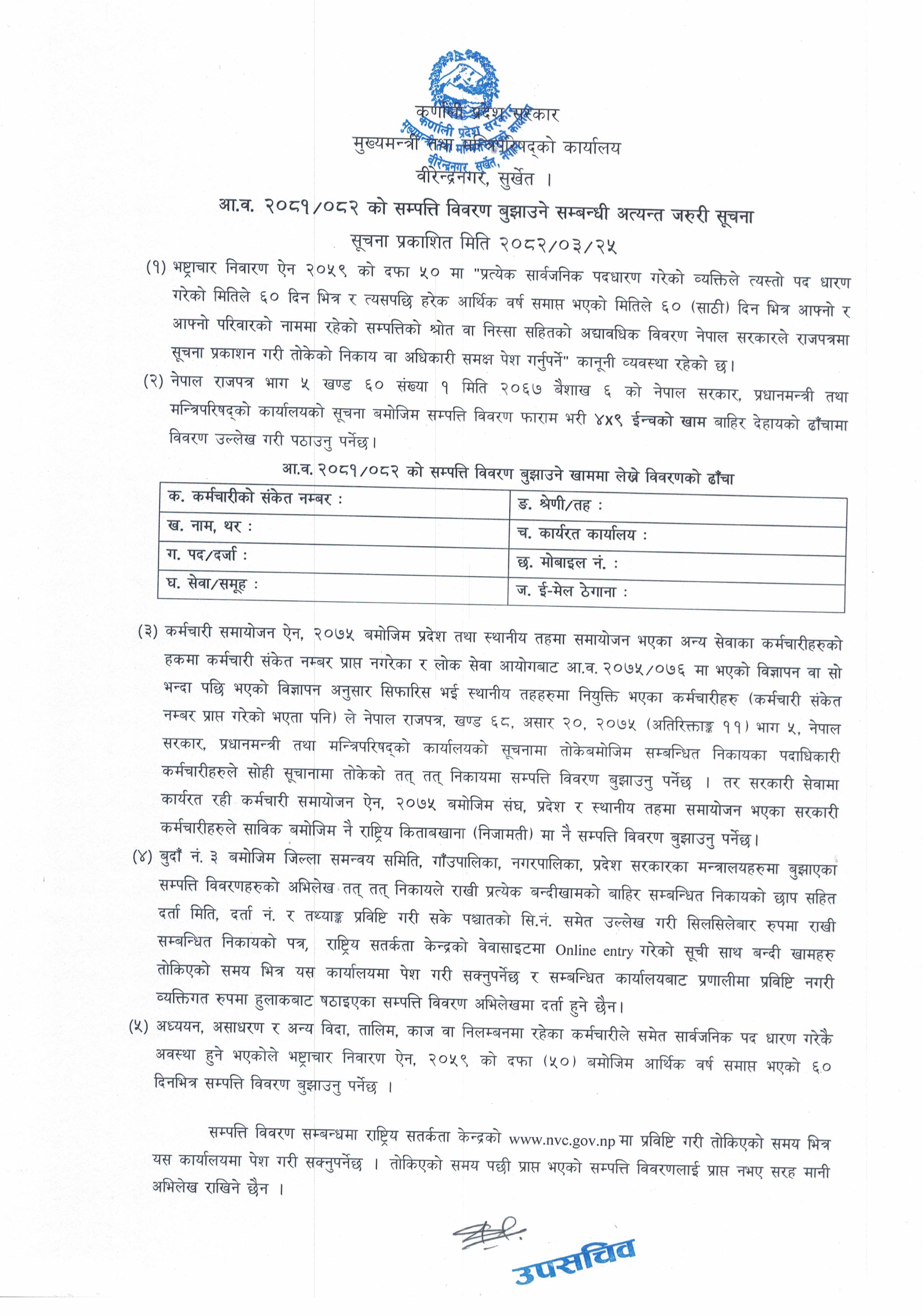 आ.व. २०८१।०८२ को सम्पत्ति विवरण बुझाउने सम्बन्धी अत्यन्त जरुरी सूचना |