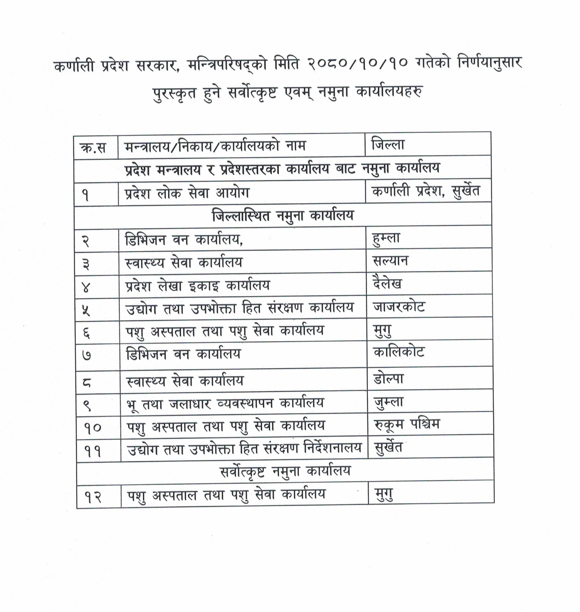 कर्णाली प्रदेश सरकार, मन्त्रिपरिषद्को मिति २०८०।१०।१० गतेको निर्णयानुसार पुरस्कृत हुने सर्वोत्कृष्ट एवम् नमुना कार्यालयहरु |