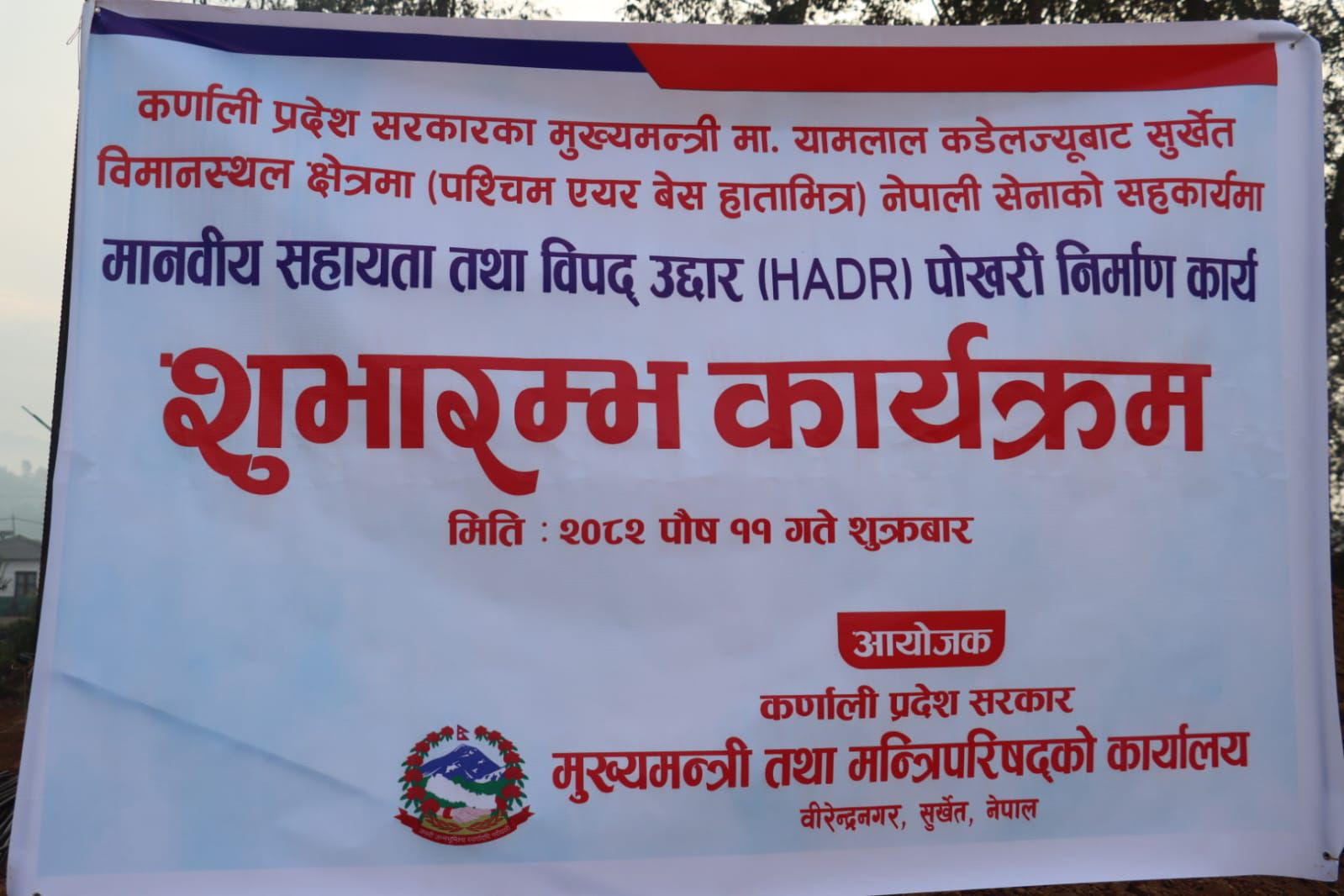 कर्णाली प्रदेश सरकारका मुख्यमन्त्री मा. यामलाल कडेलज्यूबाट सुर्खेत विमानस्थल क्षेत्रमा पश्चिम एयर बेस हाताभित्र नेपाली सेनाको सहकार्यमा मानवीय सहायता तथा विपद् उद्दार (HADR) पोखरी निर्माण कार्य शुभारम्भ कार्यक्रम